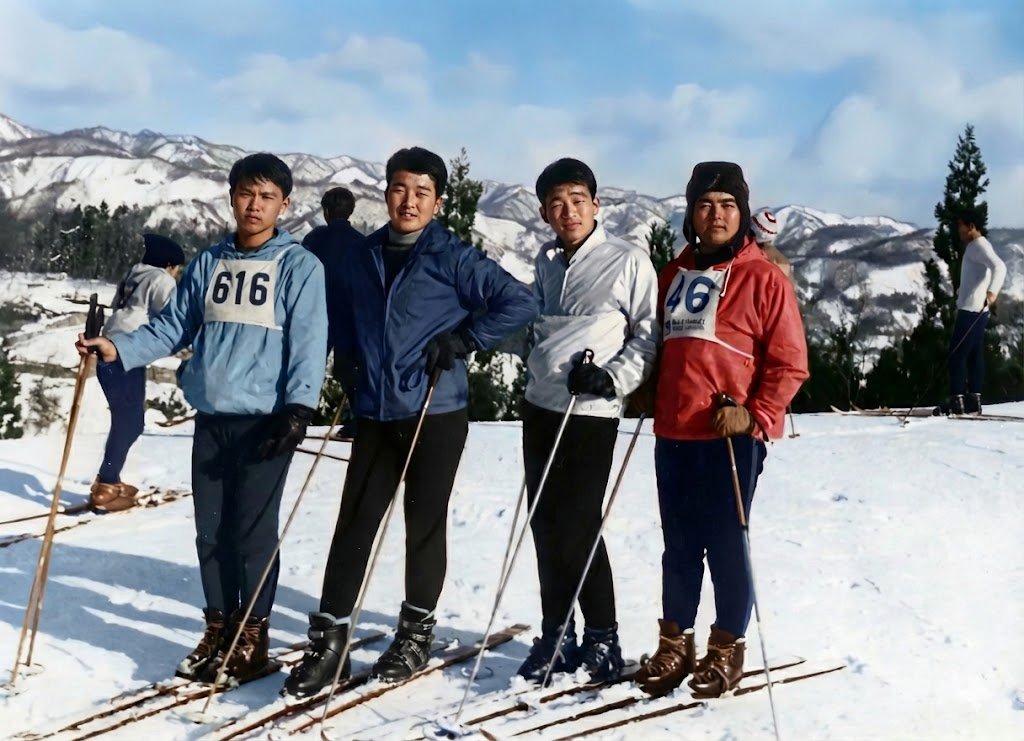 竹のストック、皮の靴、ネジ止めエッジの板、皮紐の流れ止め、八方尾根スキ−学校のゼッケン。